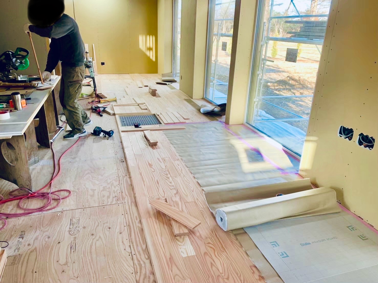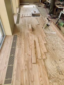 木工事:カラマツ床張り,養生