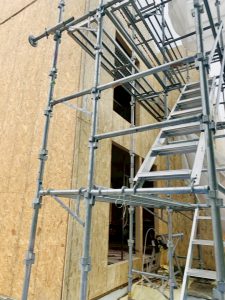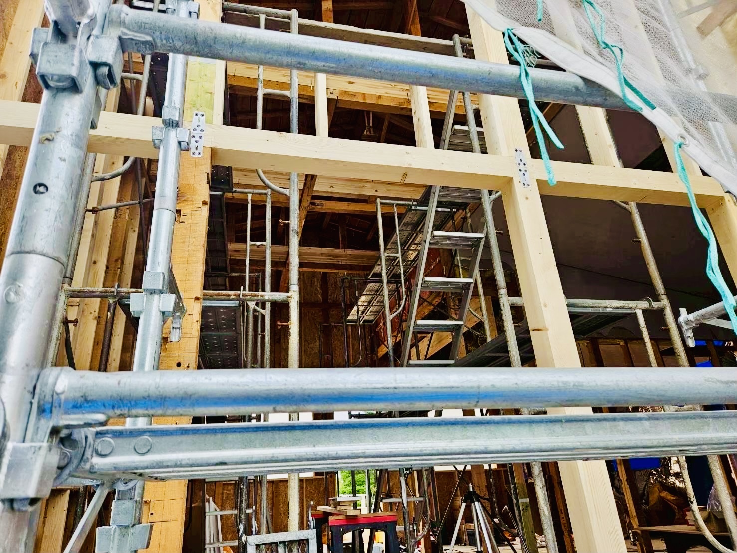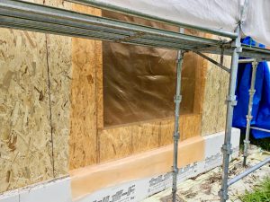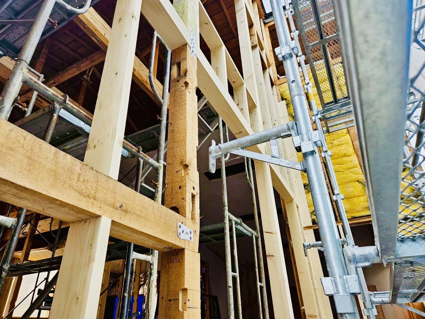 木部構造復旧:内部_間仕切組替新設、外周_柱頭脚金物,既存GW,通気止め,セルボード,発泡ウレタン補修,壁OSB合板