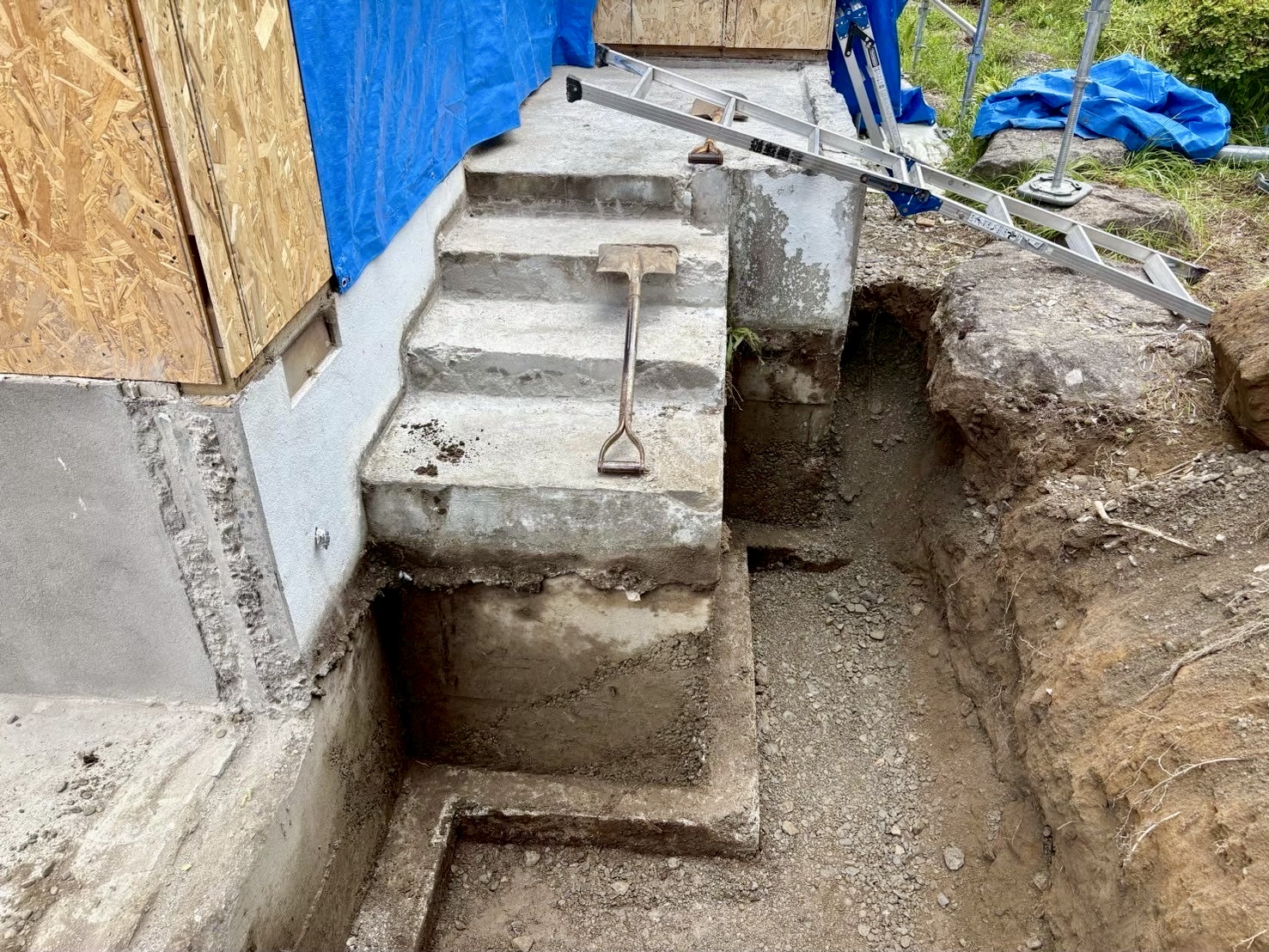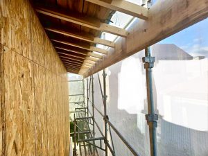 木部構造復旧:内部_間仕切組替新設、外周_柱頭脚金物,既存GW,通気止め,セルボード,発泡ウレタン補修,壁OSB合板