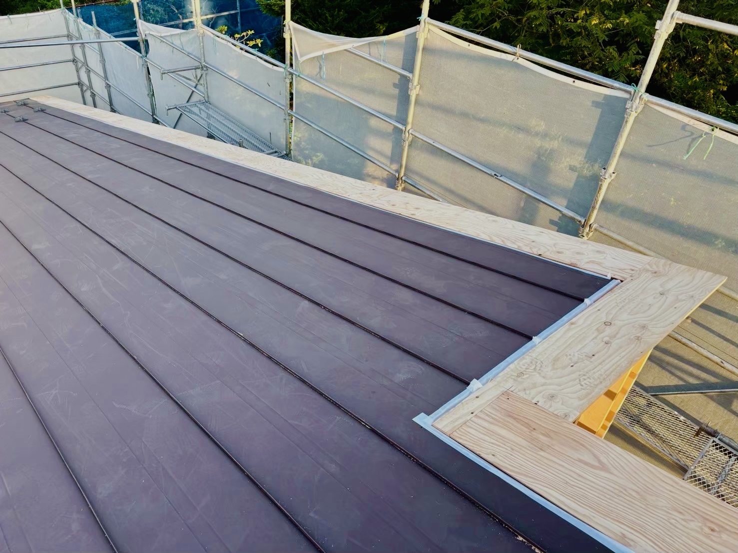 木工事:外周_付加断熱の下地、増築部_軸組、防腐防蟻塗装、屋根軒下地、養生ほか