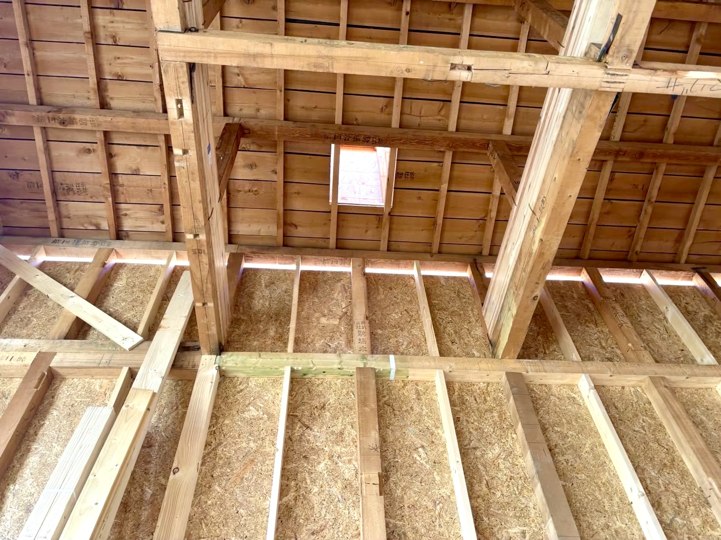 木工事:床段差調整・下地・合板、軸組・間仕切変更新設、付加断熱210GW・タイベック・通気胴縁、各スリーブ取付、煙突下地、養生ほか