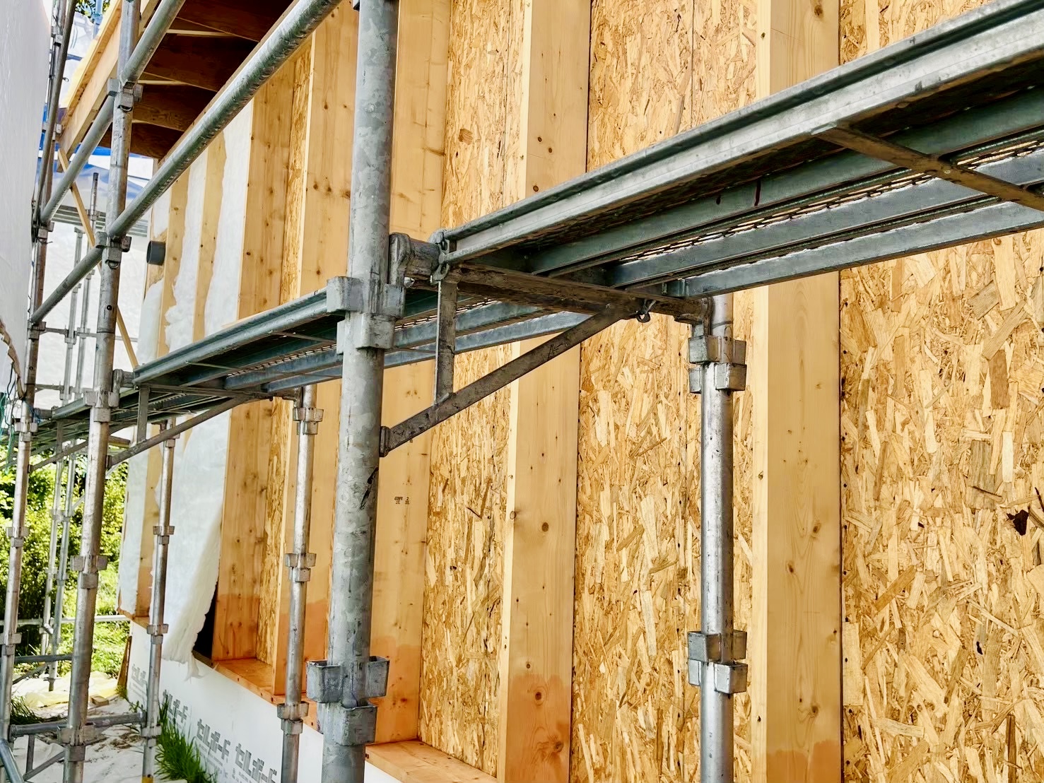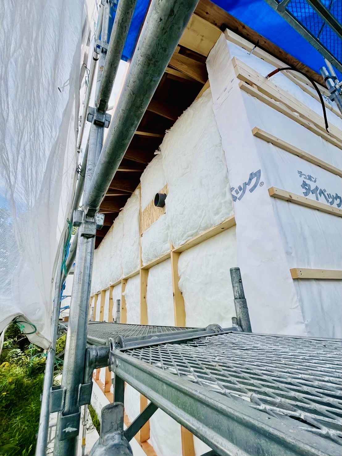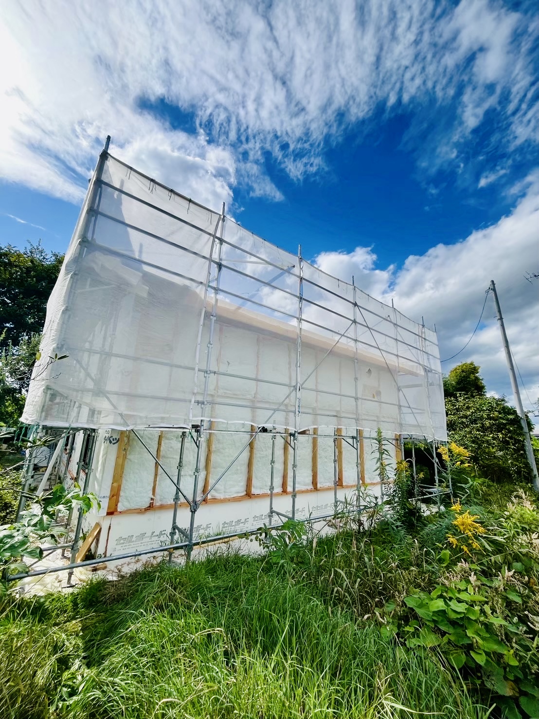 木工事:床段差調整・下地・合板、軸組・間仕切変更新設、付加断熱210GW・タイベック•通気胴縁、各スリーブ取付、煙突下地、UB周り断熱気密PB、養生ほか