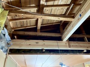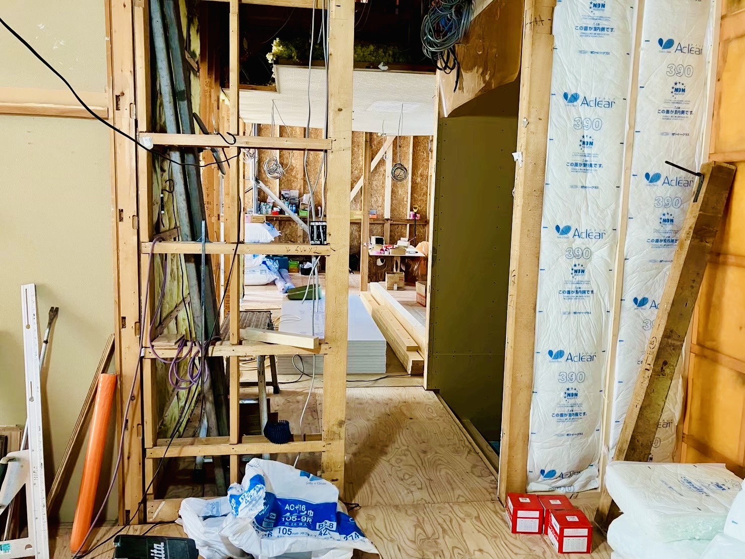 木工事:床段差調整・下地・合板、軸組・間仕切変更新設、付加断熱210GW・タイベック•通気胴縁、各スリーブ取付、煙突下地、UB周り断熱気密PB、養生ほか