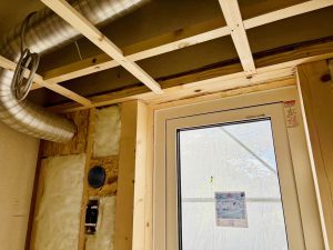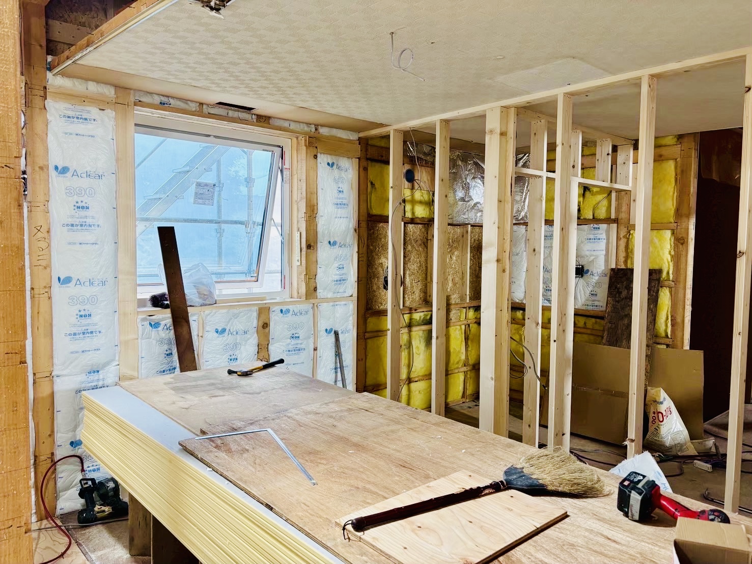 木工事:断熱欠損部充填、内部外周柱間充填断熱,気密シート、天井壁下地,PB、養生ほか