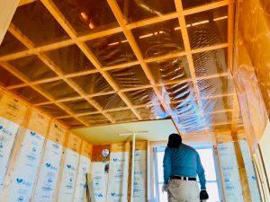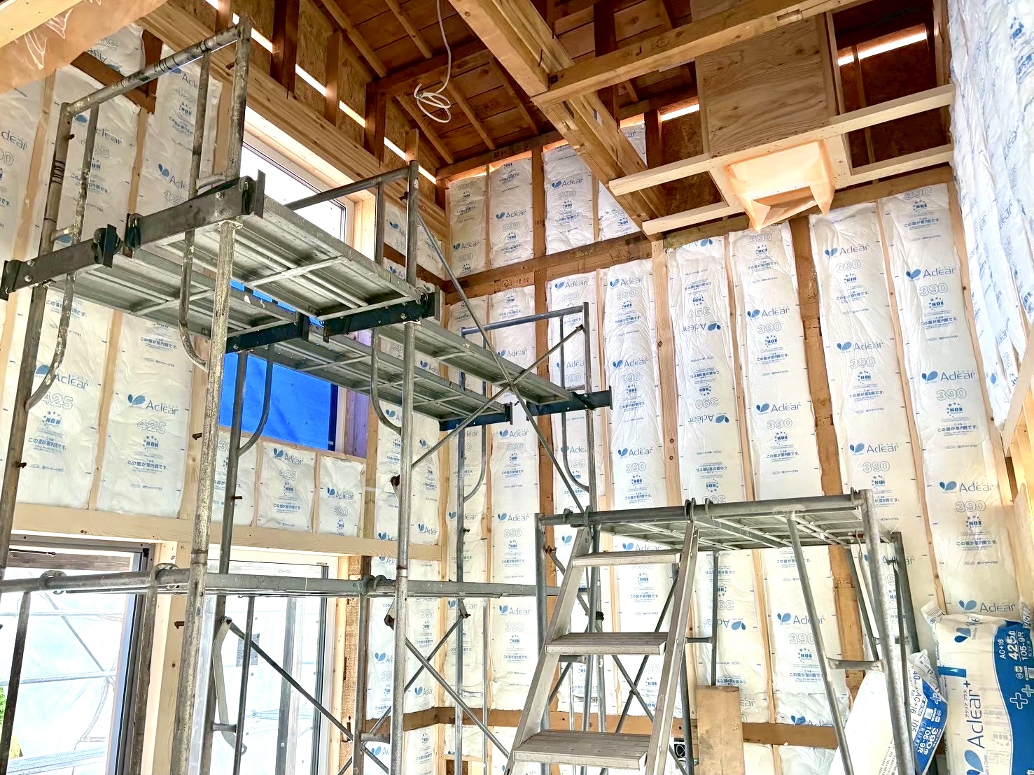 木工事:断熱欠損部充填、内部外周柱間充填断熱,気密シート、天井壁下地,PB、養生ほか