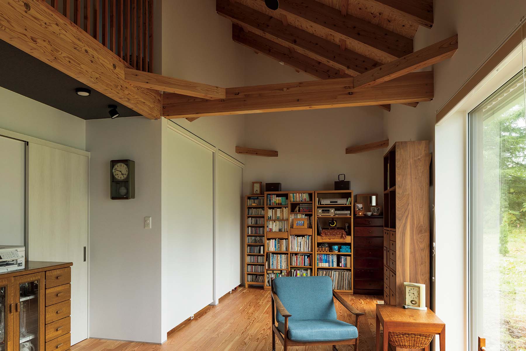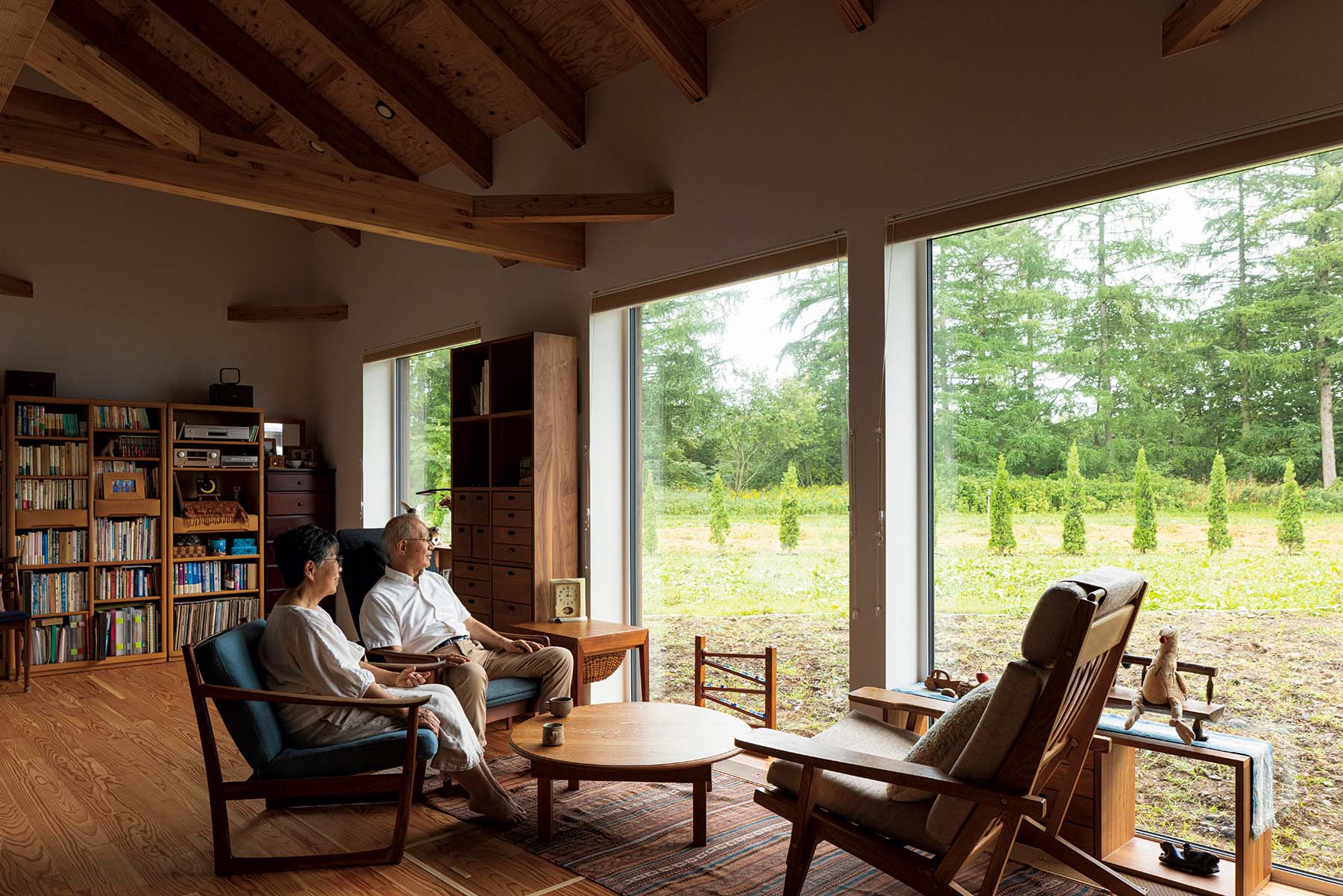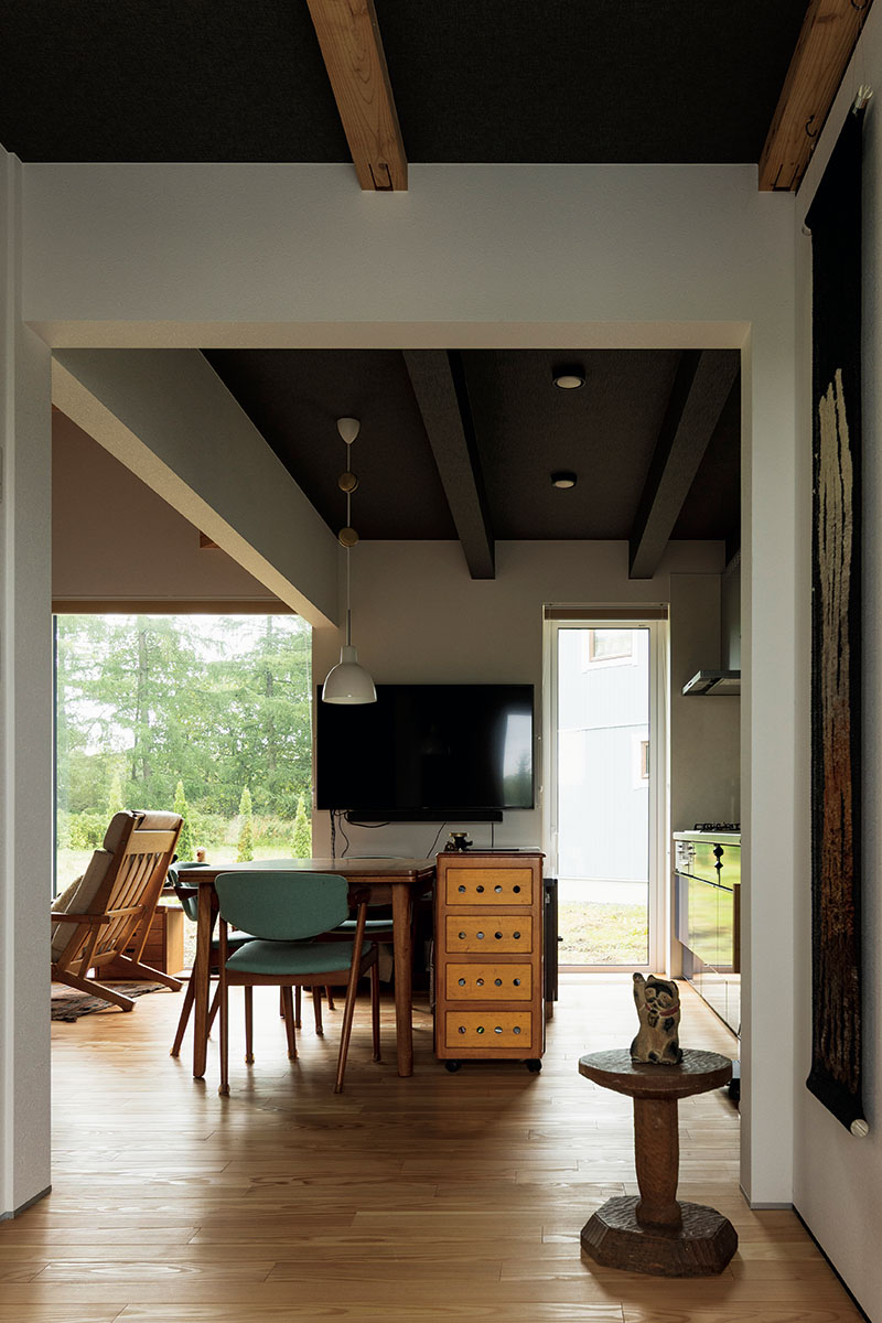 リビングから望む十勝らしい防風林と村有緑地も、土地購入の決め手になった。奥さんが集めたデンマークの古い椅子たちも、緑が染み込む空間にしっくりとなじむ