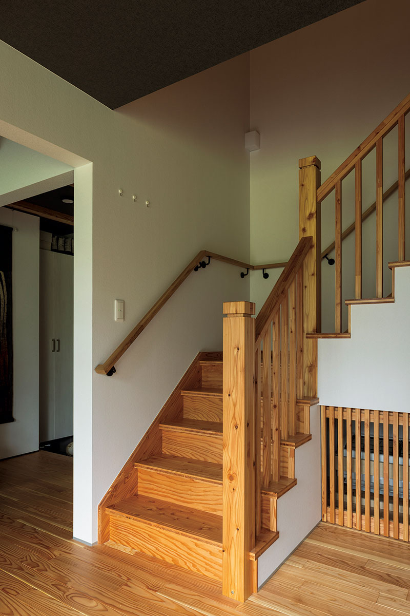 暖冷房用エアコンを格納している階段下スペース。ルーバーや階段の手すりなども大工の技が光る造作