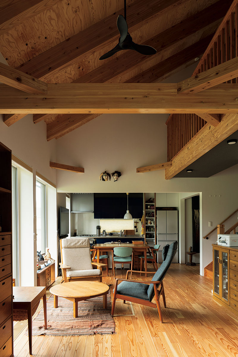 約26坪の住まいは、1階に建具や間仕切りを最小限にした開放感のあるLDKと水まわり、吹き抜けでつながる2階には寝室と書斎をレイアウト。移住後は、1階で奥さんが趣味の手仕事を楽しみ、2階の書斎ではEさんが45年の研究生活の総括となる論文制作に取り組んでいます。