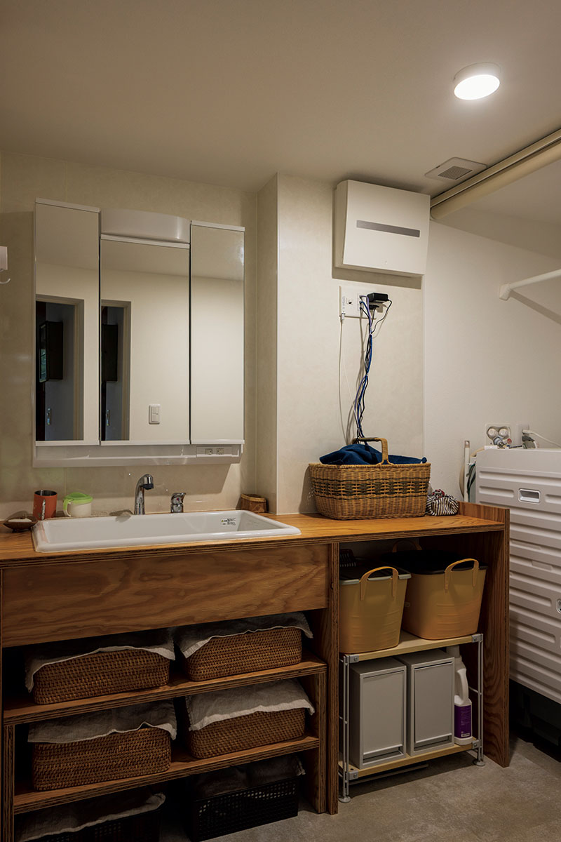 1階リビング横に、トイレ、ユーティリティ、浴室を集約。ミラー収納とオープン棚、実験用シンクを組み込んだ洗面台は造作仕様