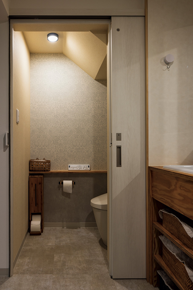 ユーティリティに隣接するトイレは階段下スペースを活用。腰壁カウンターを造作し、引き戸を採用した