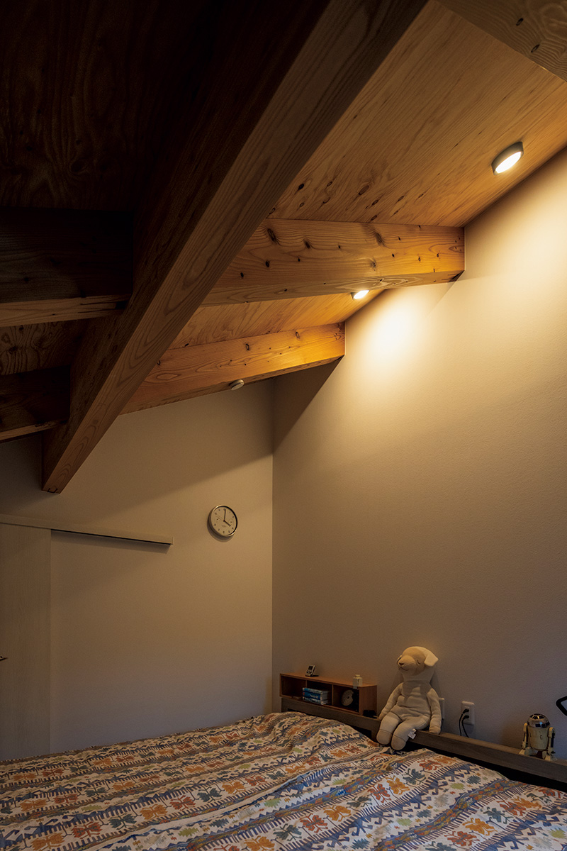 屋根裏のようなこもり感のある、落ち着いた雰囲気の寝室
