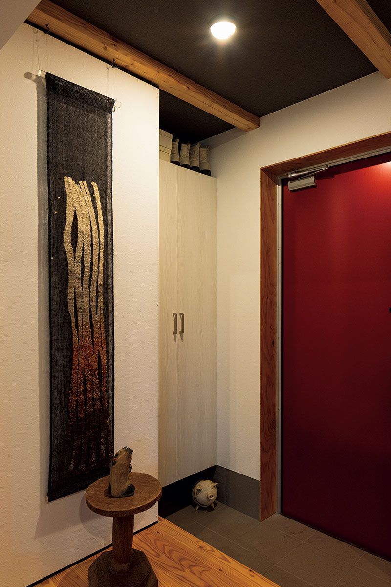 シューズボックスを造作したコンパクトな玄関には、奥さんが手織りを習った染織家の作品が飾られている